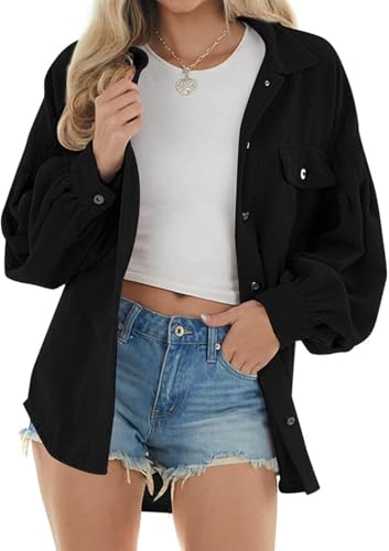 Chemise Ample Décontractée en Velours Côtelé à Manches Lanternes pour Femme, Nouvelle Collection Hiver, Black, S
