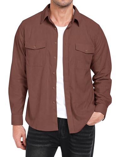 MoFiz Chemise en Velours Côtelé Homme Veste Chemise Boutonnée à Manches Longues Chaude Décontracté Haut Automne Hiver avec Poches Rouge-Marron EU S
