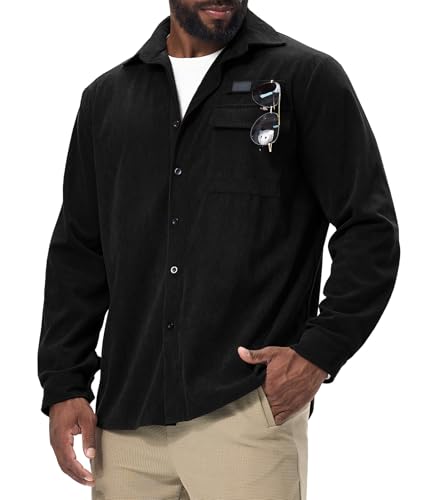 MoFiz Chemise en Velours Côtelé Homme Veste Chemise Boutonnée à Manches Longues Chaude Décontracté Haut Automne Hiver avec Poches Noir EU XL