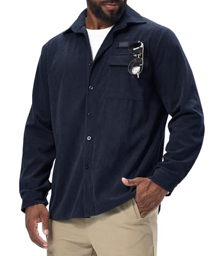 MoFiz Chemise en Velours Côtelé Homme Veste Chemise Boutonnée à Manches Longues Chaude Décontracté Haut Automne Hiver avec Poches Bleu Foncé EU 3XL