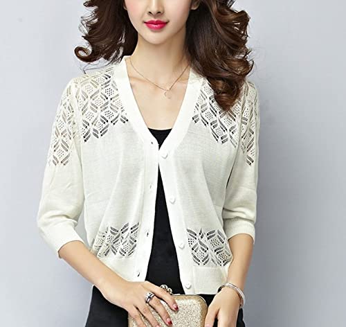 LCDIUDIU Gilets Femme, Cardigans Boléro en Maille Florale pour Femmes Chemisier D'Été pour Femme À Manches 3/4 Shrug Top Pull en Tricot Slim Évider Veste Légère pour Les Filles Habillées,White,M