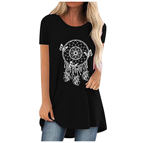 Masrin Pull long ample pour femme - T-shirt d'été décontracté - Imprimé attrape-rêves - Col rond - Manches courtes - Patchwork - Chemisier long - Coupe ample - Chemisier Tuika - Grande taille
