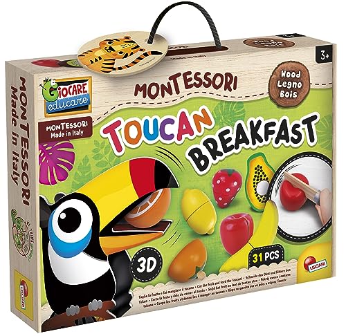 Lisciani - MONTESSORI WOOD - Toucan Breakfast - Jeu en Bois en 3D pour Enfants Dès 3 Ans - 31 pièces - Apprends à Couper les 8 Fruits - Développement Cognitif et Motricité Fine