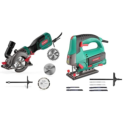 HYCHIKA BETTER TOOLS FOR BETTER LIFE Scie Circulaire 750W 3500RPM, 3 Lames(115 & 125mm), Profondeur de Coupe 48mm(90°), 32mm(45°), Idéal pour Couper du Bois, Carrelage, Métal Mou