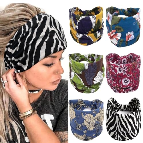 6 Pièces Bandeaux Larges pour Femmes,Bandeau Cheveux pour Femme Yoga Courir Bandeaux Sport Entraînement,Sport Course Headband,Bandeau Cheveux Femme,Headband Elastique Large Flower Headwear(Impression)
