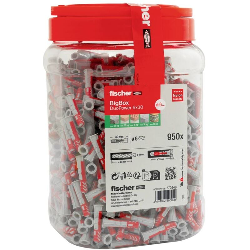 Fischer – Cheville DuoPower 6x30 570548 – 950 pièces – Polyamide pour béton et brique – Installation facile sans glissement