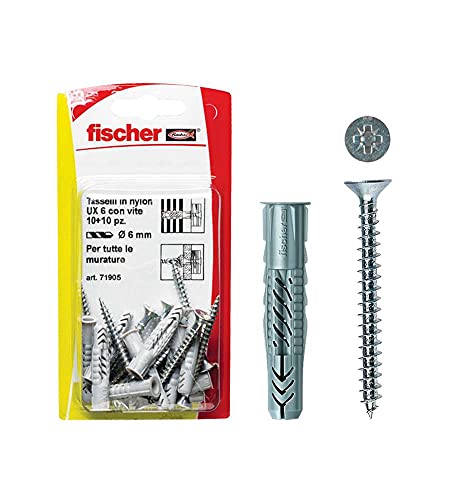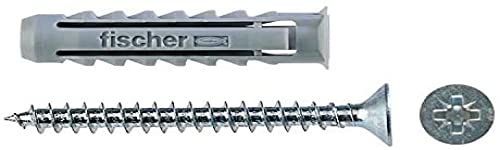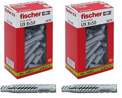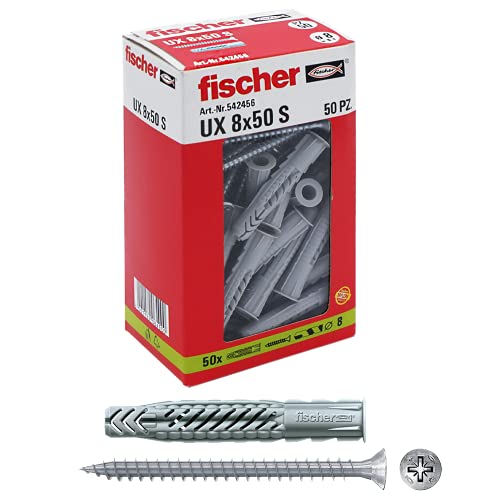 Fischer 50 chevilles UX avec vis, 8 x 50 mm avec vis, pour mur plein, brique perforée, cloison sèche, gris