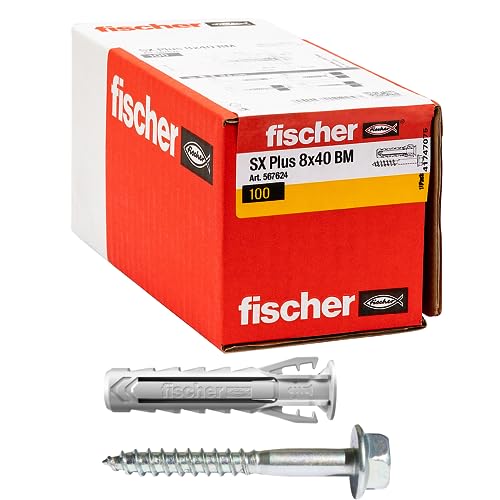 Fischer Lot de 100 chevilles SX Plus BM avec vis tête hexagonale 8 x 40 mm pour mur plein, brique perforée, maçonnerie, béton, pour la fixation de lustres, meubles, armoires, étagères, 567624