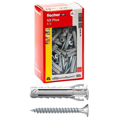 Fischer Lot de 100 chevilles SX Plus avec vis 6 x 30 mm pour mur plein, brique perforée, maçonnerie, béton, pour la fixation de lustres, meubles, armoires murales, étagères, 567621
