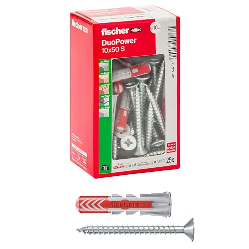 Fischer Lot de 25 chevilles avec vis DuoPower 10 x 50 mm, pour mur plein, brique perforée, cloison sèche, 537648