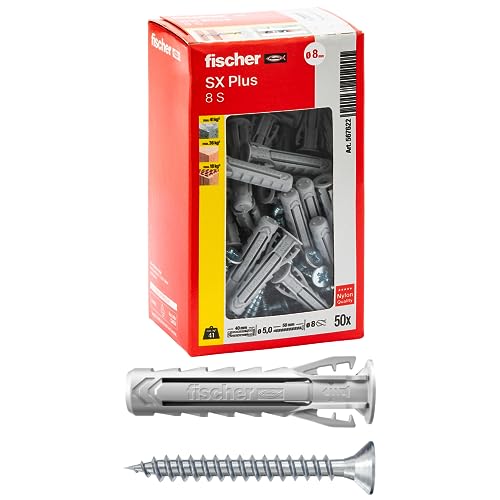 Fischer 567622 Chevilles SX Plus avec vis 8 x 40 mm pour mur plein, brique perforée, maçonnerie, béton, pour la fixation de lustres, meubles, armoires, armoires, étagères, 50 chevilles