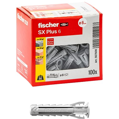 Fischer Lot de 100 chevilles SX Plus 6 x 30 mm pour mur plein, brique perforée, maçonnerie, béton, pour la fixation de lustres, meubles, armoires murales, étagères, 567606
