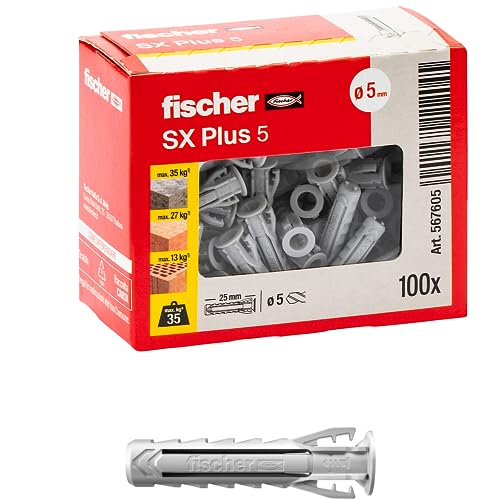 Fischer 100 chevilles SX Plus 5 x 25 mm pour mur plein, brique perforée, maçonnerie, béton, pour la fixation de lustres, meubles, armoires, étagères, 567605