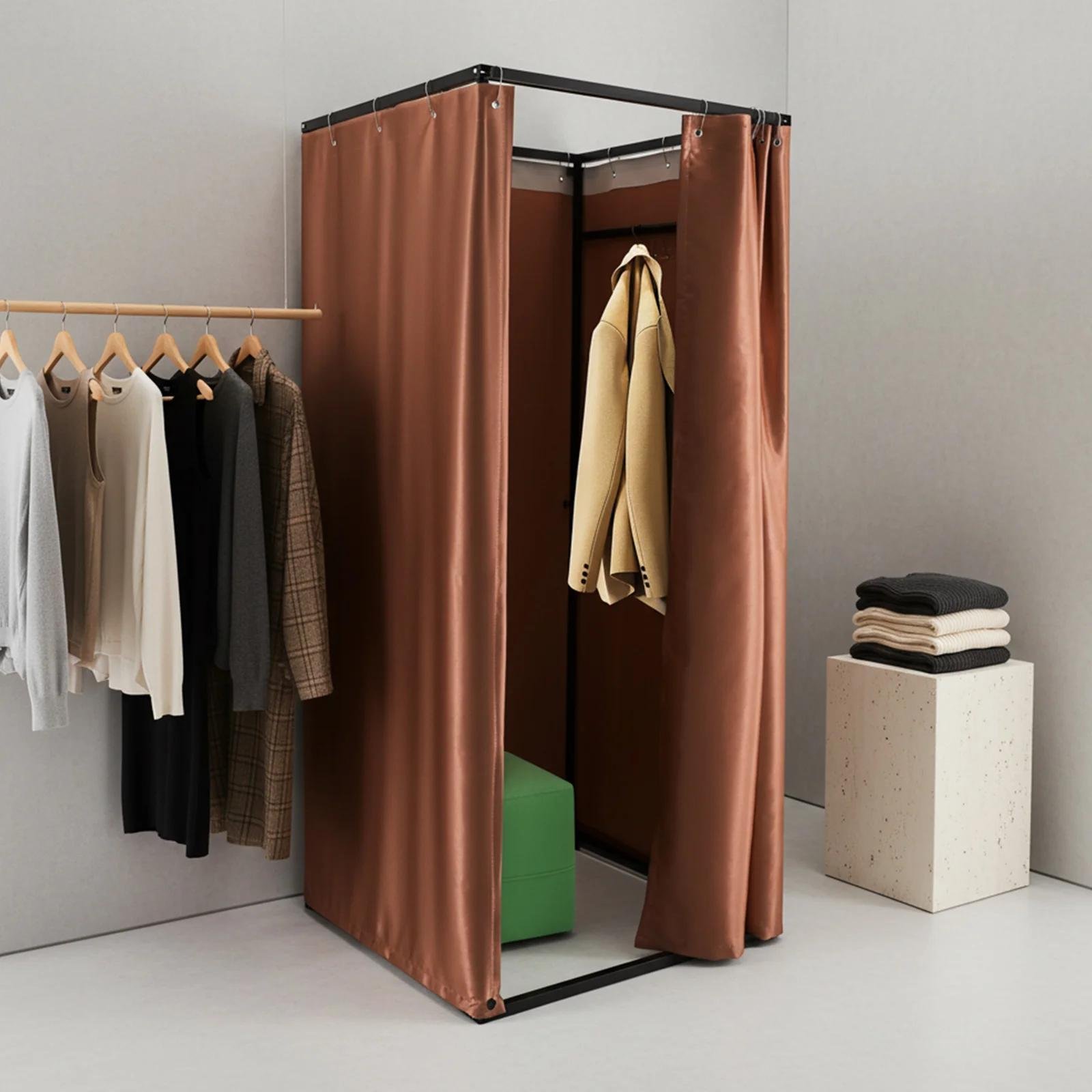 Cabine d'essayage pour magasin de vêtements - Cabine d'essayage indépendante - 85 × 85 × 200 cm - Structure en fer - Mobile - Rideau occultant - 3-4 personnes - Taille L - Marron chocolat