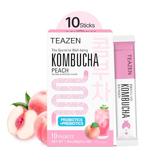 TEAZEN - Kombucha Pêche – Thé probiotique fermenté instantané – 10 sachets – Sans sucre, Végan, Faible en calories – Boisson fruitée Coréenne en poudre avec prébiotiques