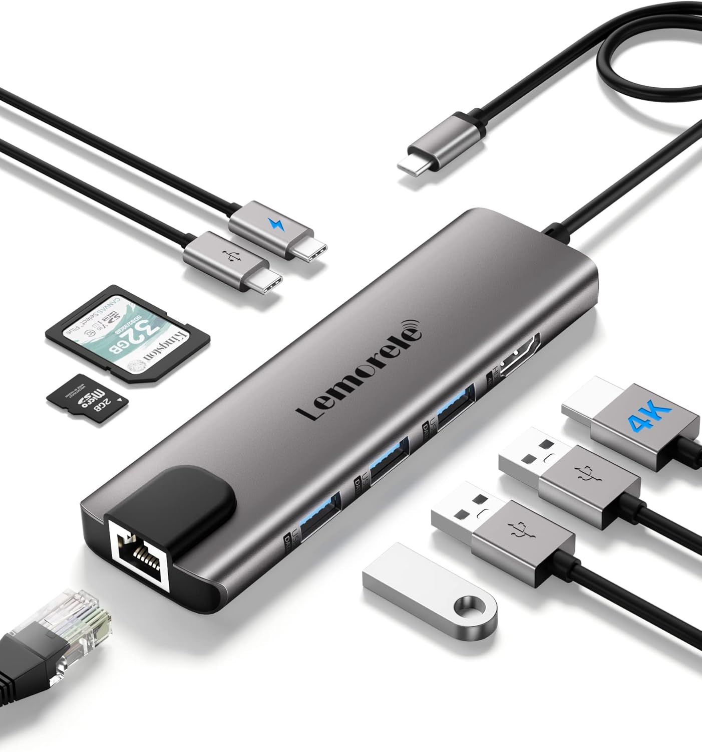 Lemorele Aluminium USB C Hub Docking Station 9 in 1 mit Gigabit Ethernet, 4K HDMI,100W PD,3 USB-A, USB-C-Daten, SD/TF, Docking Station für MacBook Air/Pro,iPad,Windows,Switch,Chromecast