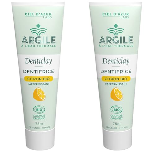 CIEL D'AZUR LABS - Denticlay Argile - Dentifrice Bio à l'Argile Blanche et à l'Eau Thermale de Digne les Bains - Certifié Bio Cosmos Organic - Tube 75ml - Citron (Lot de 2)