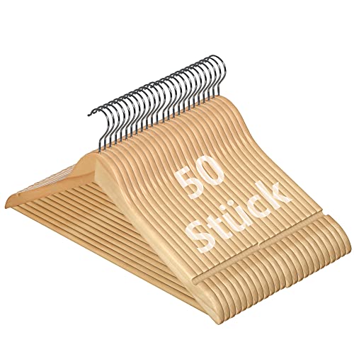 Ribelli Cintre en Bois d'érable avec Crochets en Acier, Encoches pour Jupes et Barre de Pantalon, 32 ou 50 pièces, Couleur Bois ou Blanc, Couleur:Couleur Naturelle, pièce:50 pièces