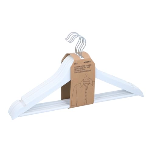 Alpina Cintres Bois Lot 5 Pièces – Cintre pour Épaules Larges - Cintres Antidérapant – Cintre en Bois – Hangers Clothes avec Barre Pantalon - Crochet Pivotant - Blanc