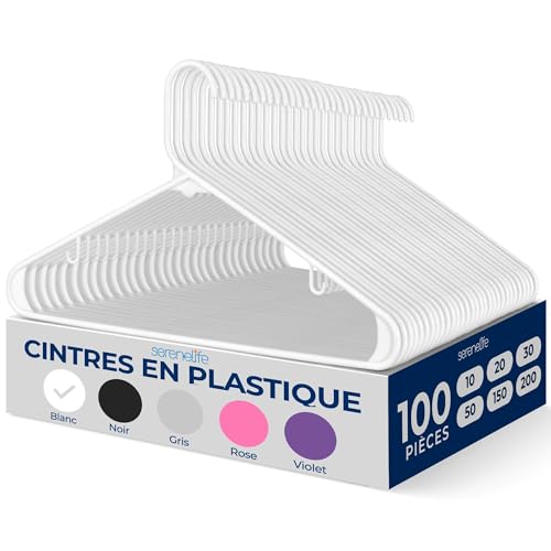 Serenelife Cintres Plastique Blanc, Cintre Gain de Place, Durables et Fins, Parfaits pour Le Linge/Un Usage Quotidien, Peuvent Supporter jusqu'à 2,5 kg pour Manteaux, Costumes, Robes - Lot de 100