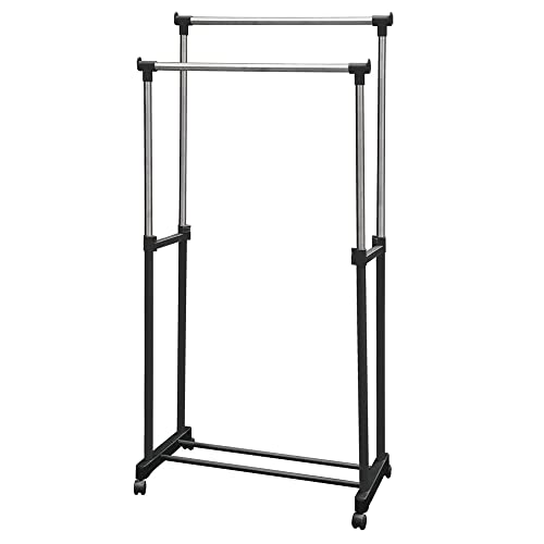 Homewell Cintre réglable sur roues, Porte Manteau Porte Vetement, Acier Inoxydable, Durable, Facile à déplacer, Noir, Rétractable en Longueur et en Hauteur (Double Barre)