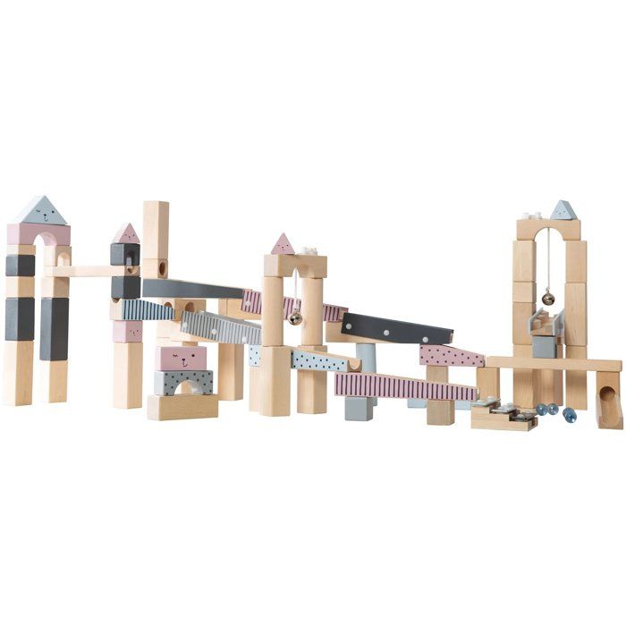 Circuit à billes en bois - ROBA - 20 billes en verre - 80 briques de construction - Naturel / Marine / Ciel / Rose