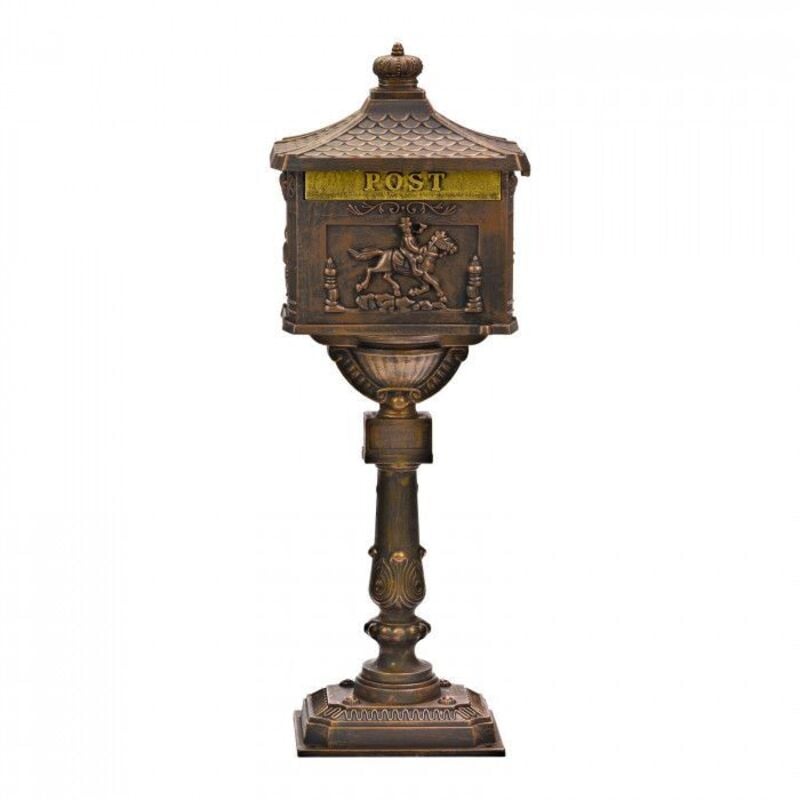 Dema – Boîte aux lettres pilier antique en aluminium moulé – Clapet doré 30x3,5cm – Dimensions 42x29x117cm – Ancrage au sol inclus