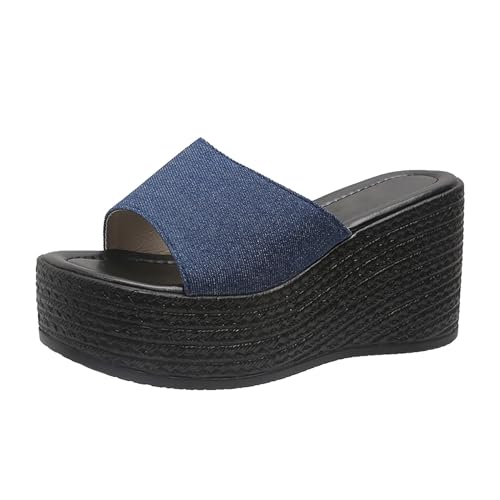 Chaussons Femme Sandales Orthopédiques Été Les femmes portent des sandales à talons hauts plats à semelles épaisses avec des talons inclinés pour les Claquette Piscine Mule Femme Été (Dark Blue, 35)