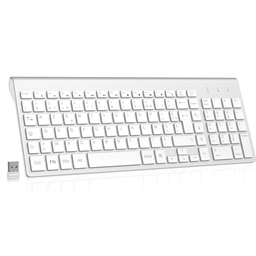 JOYACCESS Clavier Souris sans Fil, 2,4Ghz Ultra-Fins Compacte Clavier, Portable Silencieux 2400 DPI Ergonomique Clavier Souris pour PC, Smart TV, Ordinateur (AZERTY Disposition) - Blanc Argent