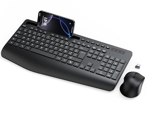 Ensemble Clavier et Souris sans Fil, Ergonomique Pleine Taille Clavier avec Repose-Poignet, Support, Mode Veille, 2,4 GHz Silencieux Clavier Souris pour Windows, PC, Laptop, AZERTY Français - Noir