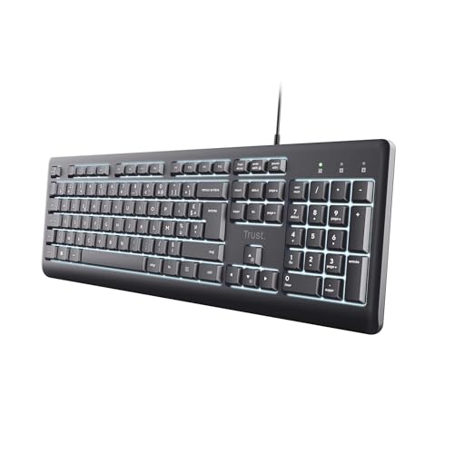 Trust Primo Clavier Rétroéclairé, Disposition Néerlandaise QWERTY, Touches Silencieuses, Clavier Filaire Anti-éclaboussures, Câble USB-C/USB-A de 1,8m, PC Ordinateur Portable Mac - Noir