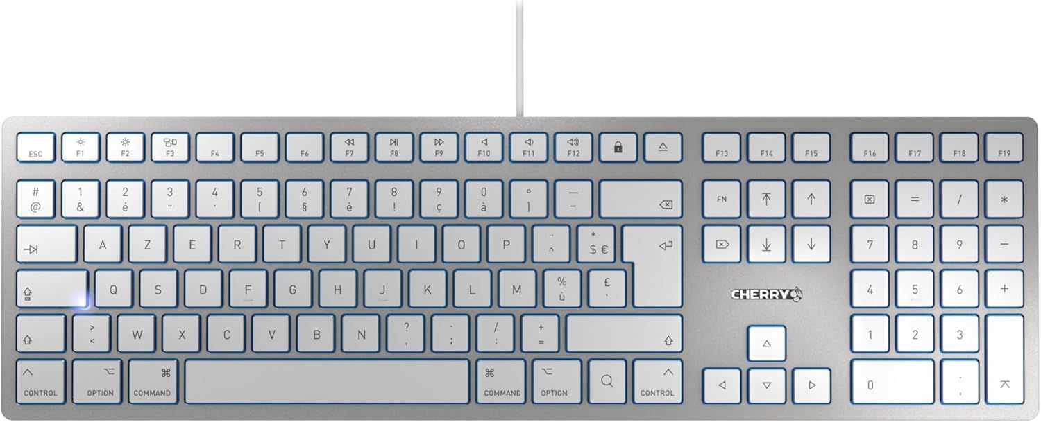 CHERRY KC 6000 SLIM FOR MAC, Clavier filaire Mac - (port USB-A), Disposition allemande (QWERTZ), Touches silencieuses, Design plat, Blanc argenté