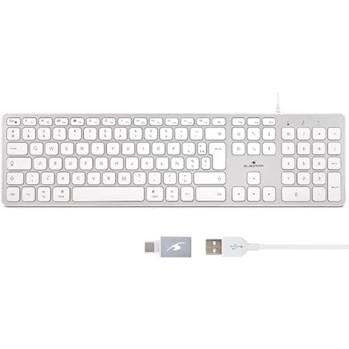 Bluestork Clavier QWERTY Filaire pour Mac - Touches concaves et silencieuses, Comprend Ñ - 13 raccourcis multimédias, Adaptateur USB/USB-C - Nouveau 2022, Blanc