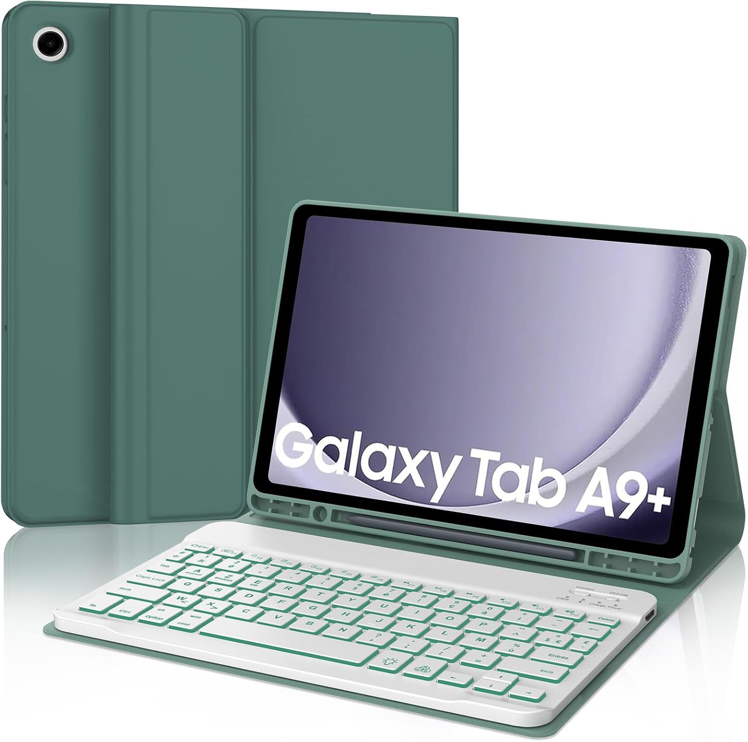 JADEMALL Coque Clavier pour Samsung Tab A9 Plus 2023 11", AZERTY Français Rétro-éclairé Clavier Bluetooth Détachable pour Samsung Galaxy Tab A9+/A9 Plus 11", Vert foncé