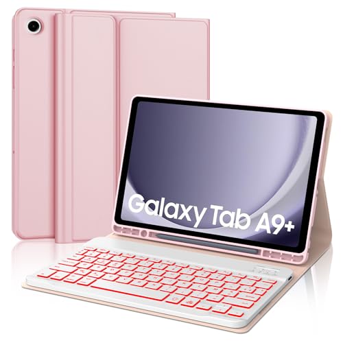 IVEOPPE Clavier Samsung Tab A9 Plus 11" 2023, Rétroéclairage 7 Couleurs, AZERTY Français Étui Clavier Magnétique Bluetooth sans Fil Etui Housse pour Samsung Tab A9 Plus (SM-X210/X216/X218), Rose