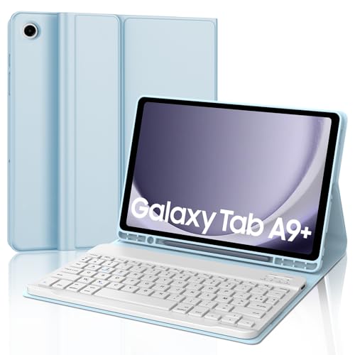 Coque Clavier pour Samsung Tab A9 Plus 11"" 2023, AZERTY Français Clavier Bluetooth Magnétique Détachable pour Samsung Galaxy Tab A9+ Plus 11 Pouces 2023, Bleu Ciel