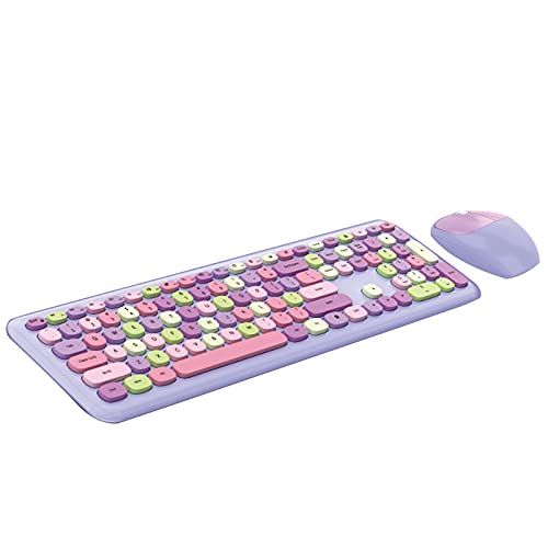 TYTUOO Ensemble clavier et souris sans fil rose, clavier sans fil, 2,4 GHz, ensemble de clavier et souris sans fil rétro, rose multicolore muet (avec batterie) (violet)