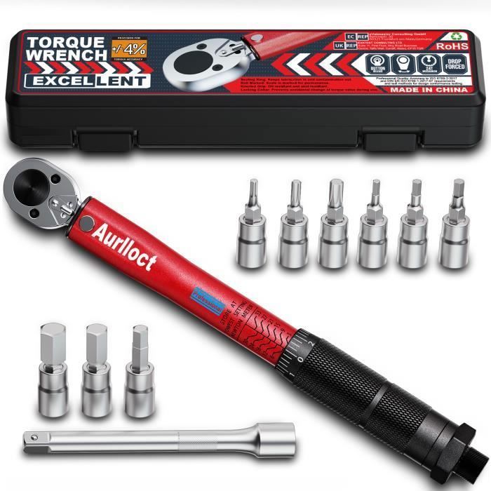 Clé dynamométrique 1/4" - 2,3-23Nm Clé dynamométrique vélo & moto Set - ± 3% précision d'erreur - 2 tiges d'extension 127 & 76,2mm - Adaptateur 1/2-1/4" - Tête de cliquet 72 dents Réglable