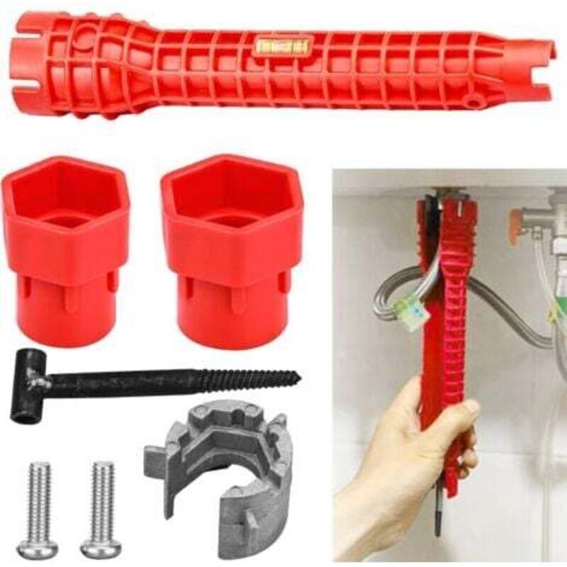 Clé Multifonction Plomberie 14-en-1 – Outil Installation Robinet et Clé Lavabo pour Évier, Toilettes et Cuisine, Clé de Plombier Universelle Rouge