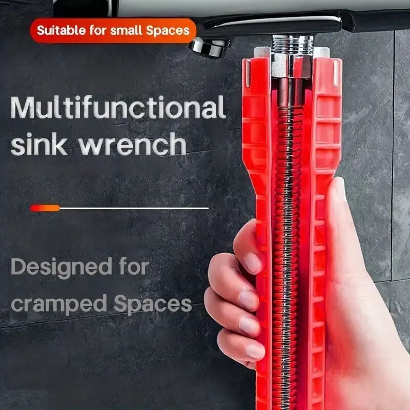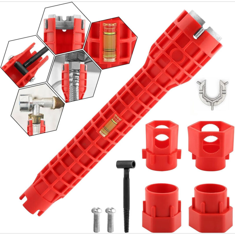 Clé Multifonction Plomberie 14-en-1 – Outil Installation Robinet et Clé Lavabo pour Évier, Toilettes et Cuisine, Clé de Plombier Universelle Rouge