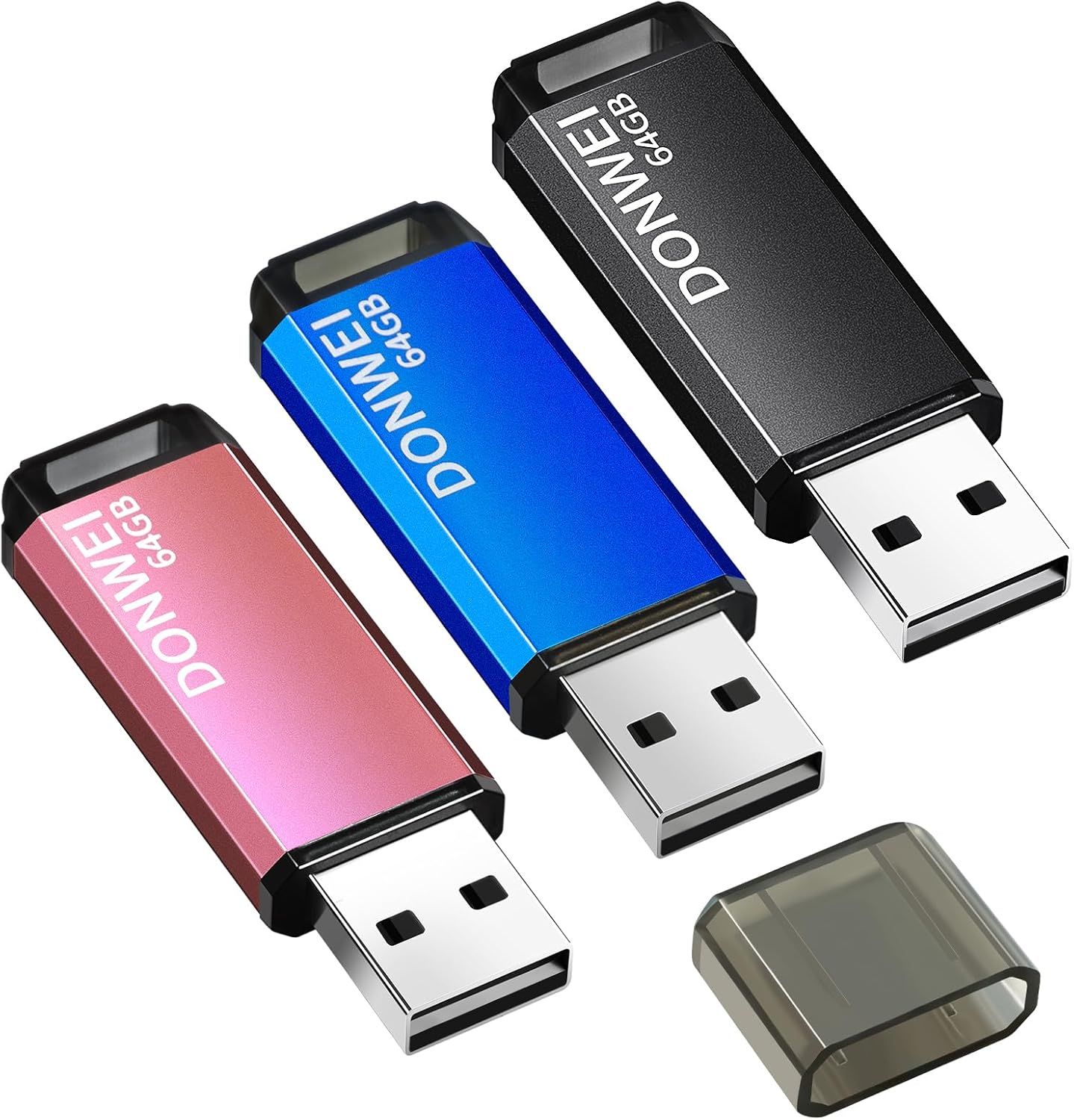 DONWEI Cle USB 64 Go, Clé USB,Lot de 3 Clés USB avec Lumière LED Rapide Grande Capacité, Métal Clef USB Mémoire Externe pour Le Stockage de Musique et des Dossiers (Rose, Bleu, Noir)