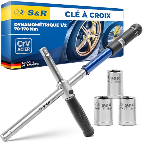 S&R Clé à Croix - Clef Dynamométrique 1/2 (70-170 Nm) Roue Auto. Clé à croix avec broche et 3 douilles 17, 19, 21 mm