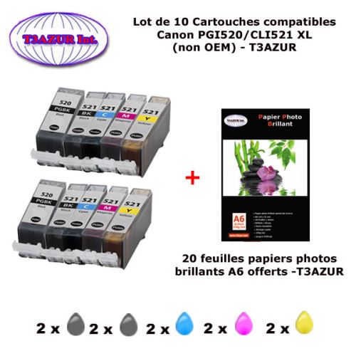 10 cartouches compatibles Canon PGI520 CLI521 XL pour Canon Pixma IP3600 IP4600 IP4600X IP4700 -20f A6 brillantes -T3AZUR