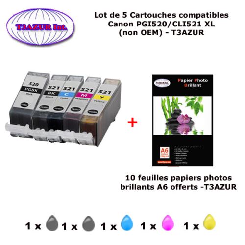 5 cartouches compatibles Canon PGI520 CLI521 XL pour Canon Pixma MP630 MP640 MP980 MP990 -10f A6 brillantes -T3AZUR