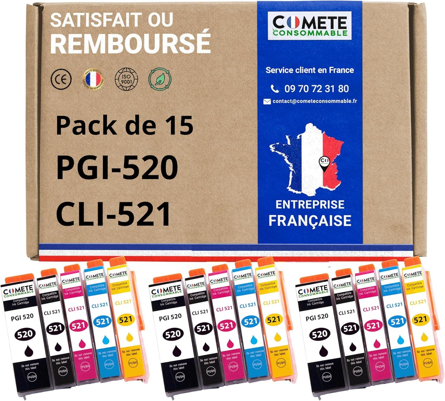 COMETE, Marque française - 520XL 521XL - 15 Cartouches d'encre Compatibles avec Canon PGI-520 CLI-521 - pour Canon Pixma IP3600 IP4600 MP550 MP620 MP640 MX860 MX870 (6 Noir et 9 Couleur)