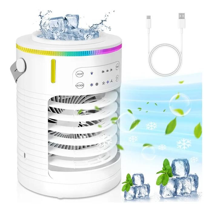 Refroidisseur d'air portable, mini climatiseur mobile, humidificateur, purificateur avec 7 lumières LED, 750 ml, blanc et bleu