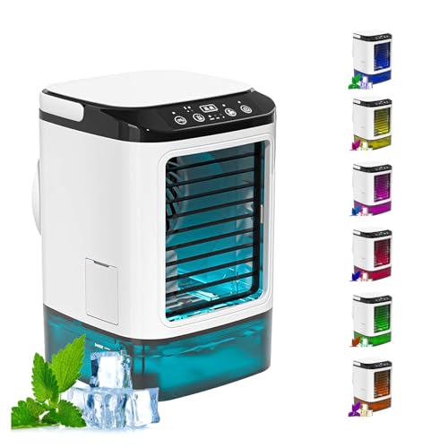 Mini Climatiseur, Réservoir D'eau 900ml,Avec Glacière Mini Climatiseur Mobile Silencieux 3 Vitesses de Vent et 7 Lumières LED Climatisation Mobile Sans Évacuation Pour Le Bureau De Chambre