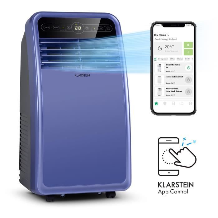 Climatiseur mobile avec evacuation - Klarstein - 7000 BTU - Commande via app - Fonction ventilateur & déshumidificateur - Bleu
