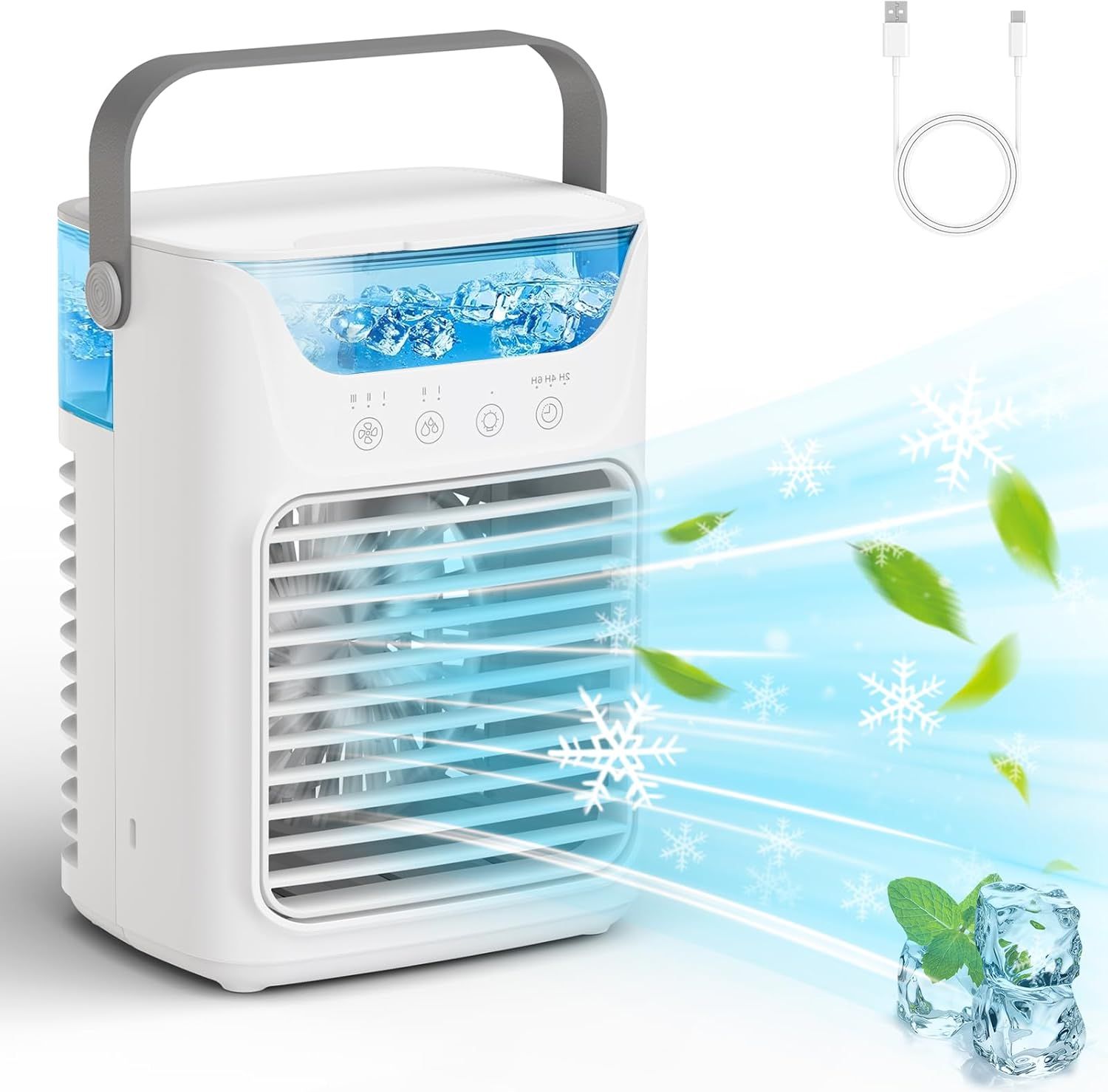 Petit ventilateur de climatiseur USB – Ventilateur de refroidissement pour espace personnel, climatiseur de bureau silencieux à évaporation, refroidisseur d'air mobile avec veilleuse pour la maison,