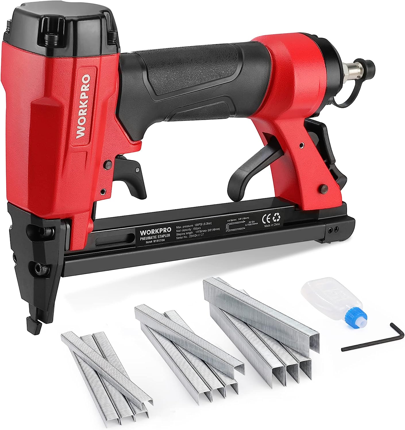 Agrafeuse Pneumatique avec 1884 Agrafes WORKPRO, Cloueuse Pneumatique Utilisée les Agrafes de Type 71/6-16 mm, Idéal pour Bricolage, Décoration, Murale, Tapisserie, Bois